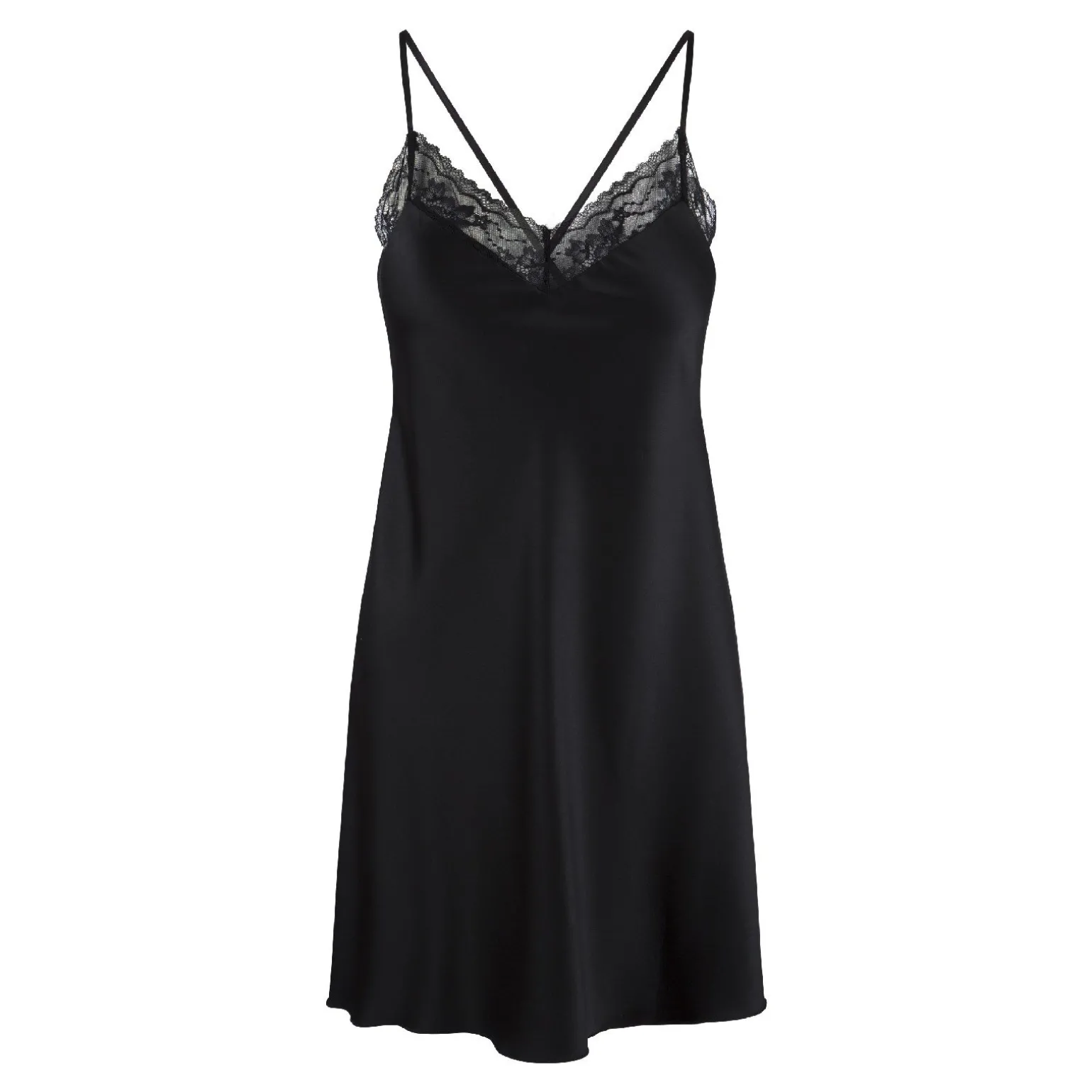 “In the depths of black lingerie lies a story of mystery.” De chemise is gemaakt van satijn en is afgewerkt met sierlijk kant langs de halslijn. Aan de achterzijde is het ook afgewerkt met kant in een V-lijn.