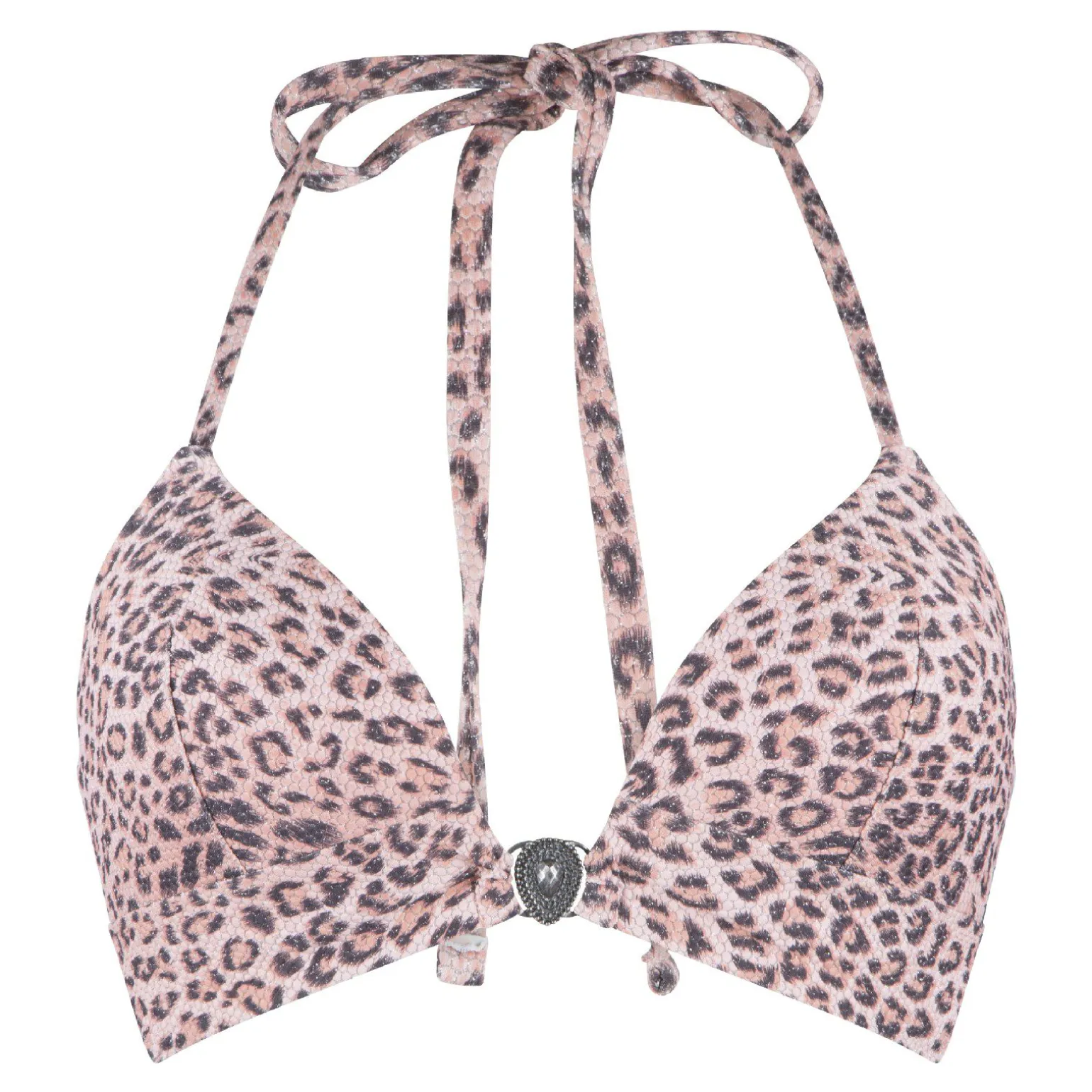 Pink leopard- Schitter in deze voorgevormde halterbikini top in leopard print. De stof heeft een fijn zilver lurexdraadje voor een elegante touch.