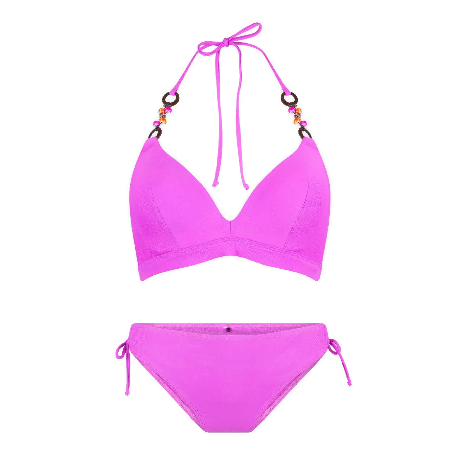 Summer vibes! Met deze kleurrijke bikiniset in pink of groen ben je meteen klaar! De voorgevormde bikini top heeft een haltersluiting in de nek en de bandjes hebben een leuk detail met kralen. De bikini slip heeft een normale pasvorm met verstelbare koordjes aan de zijkant voor een perfecte fit!
