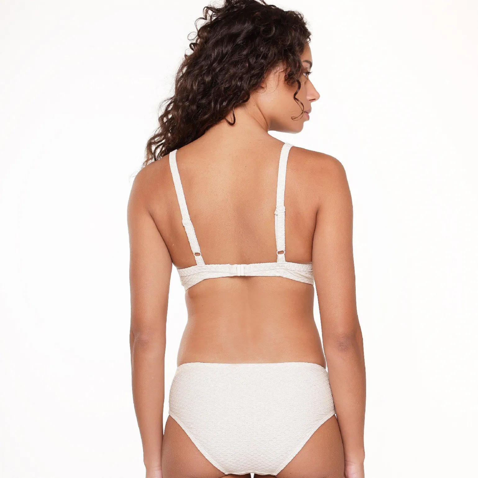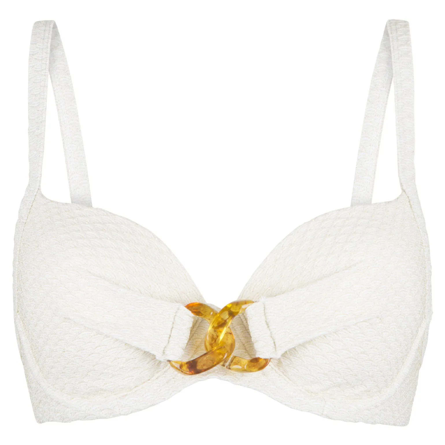 Rise & shine in deze geweldige serie! Deze serie trekt zeker de aandacht door de luxe structuur stof en gouden accessoire. De bikini is voorgevormd, heeft verstelbare schouderbandjes en is voorzien van een beugel. Hierdoor is deze bikini ook zeer geschikt voor de grotere maten.