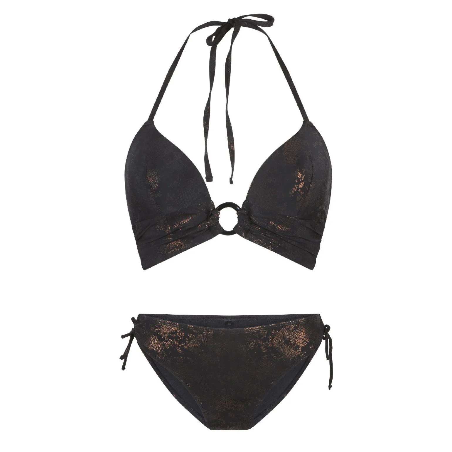 Black copper snake print: Copper details make magic! Deze serie is uniek door de koperen slangenprint op de bikini. De top is een triangle bikini met voorgevormde cups, met een bijpassend bikini broekje met strikdetails aan de zijkanten! Ben je op zoek naar een stijlvolle bikini set, dan is deze serie zeker aan te raden!