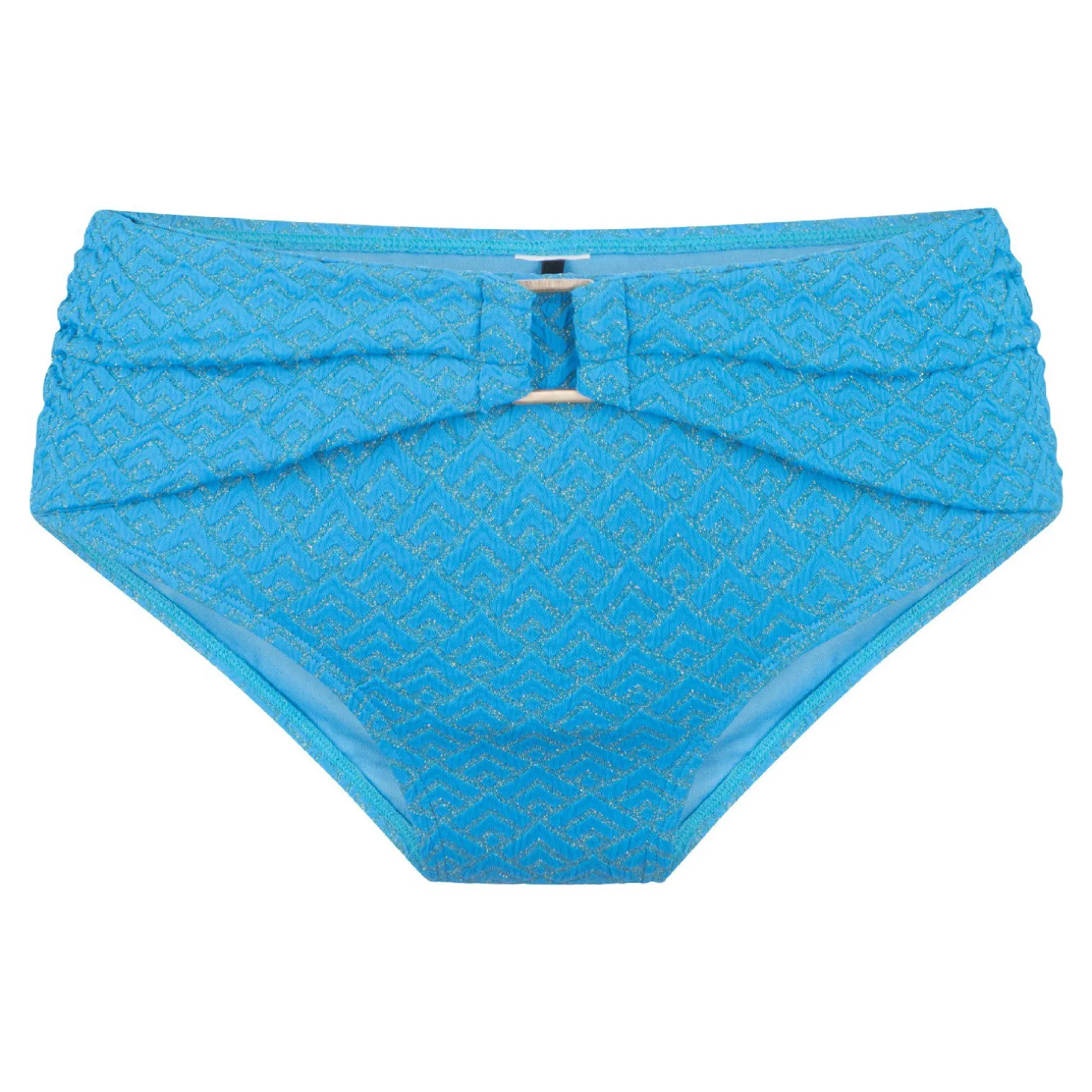 Sparkling blue! Deze bikini short heeft een fijn gouden lurexdraadje wat zorgt voor een luxe touch. De short heeft een wat hogere pasvorm. De dubbele stof met gouden vierkanten ring aan de voorkant zorgt voor een elegante look.