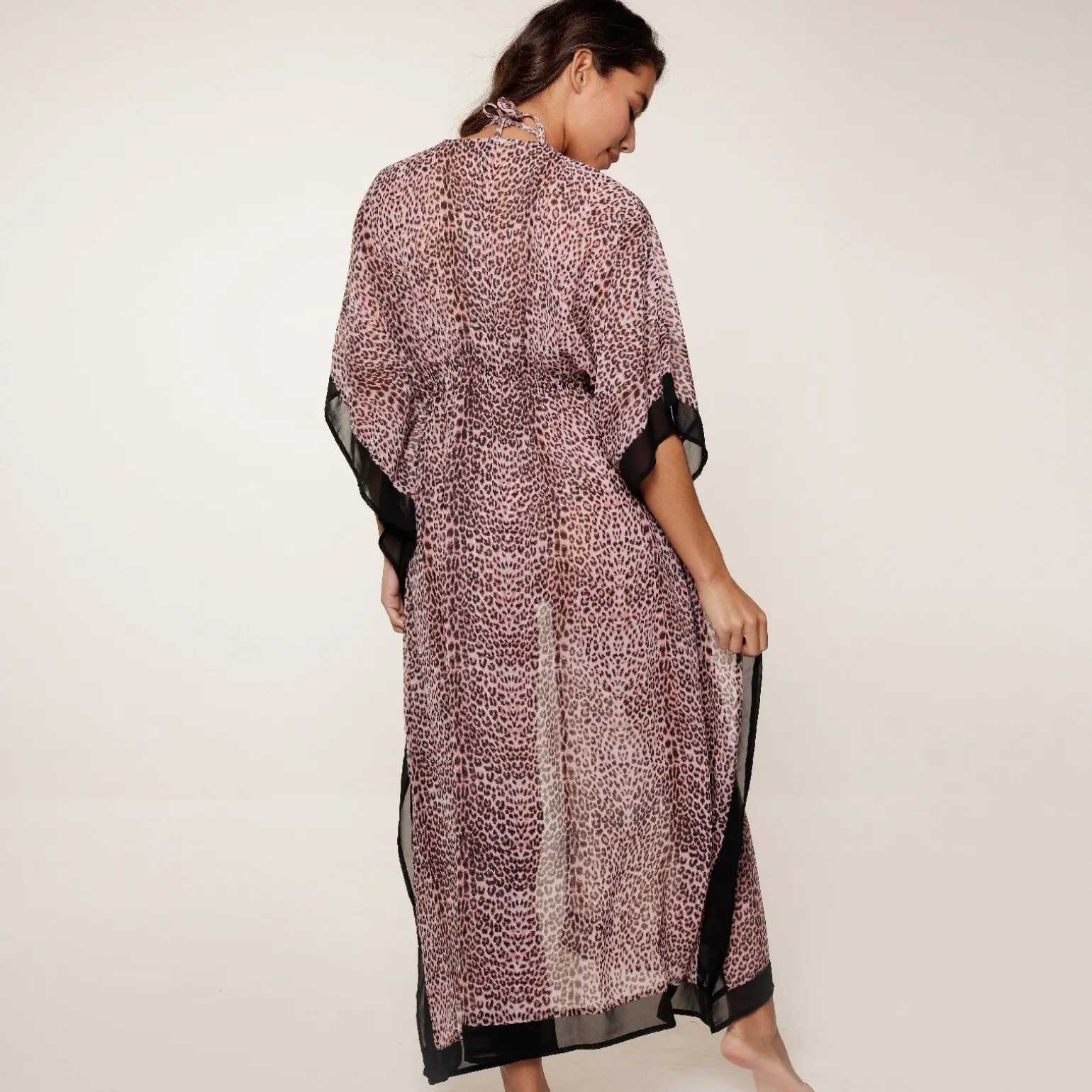 Pink leopard- Maak je beachoutfit compleet met deze prachtige, lange kimono in leopard print. De kimono is gemaakt van luchtig, soepel materiaal en kan aan de voorkant dicht worden gemaakt met een koordsluiting.