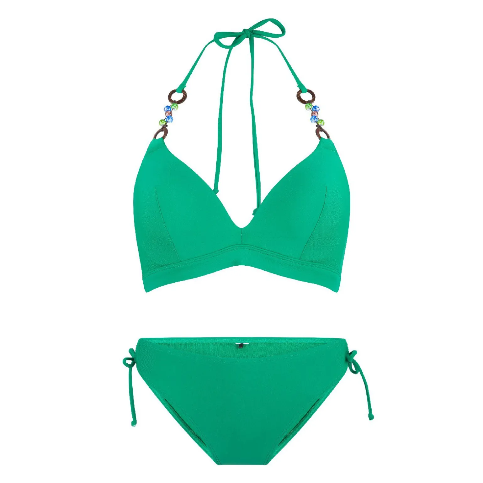Summer vibes! Met deze kleurrijke bikiniset in pink of groen ben je meteen klaar! De voorgevormde bikini top heeft een haltersluiting in de nek en de bandjes hebben een leuk detail met kralen. De bikini slip heeft een normale pasvorm met verstelbare koordjes aan de zijkant voor een perfecte fit!